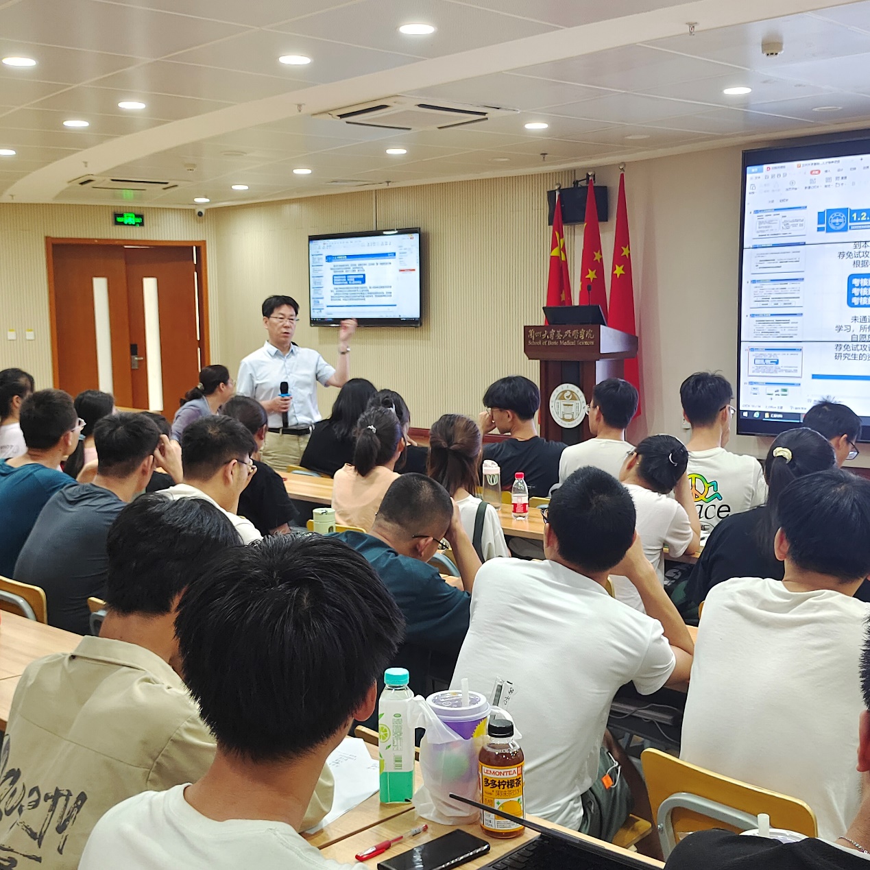 邀请学院教学名师为同学们讲授课堂艺术及演讲技巧,并于7月14日-20日安排2022级学生开展为期一周的教学能力实践,每位学生讲课至少20分钟,通过对学习过的基础医学整合课程进行梳理讲解,达到教学相长的目的,2023级学生为听众,了解器官系统课程体系,教师对每位学生的课程做点评,实践结束后撰写实践报告。